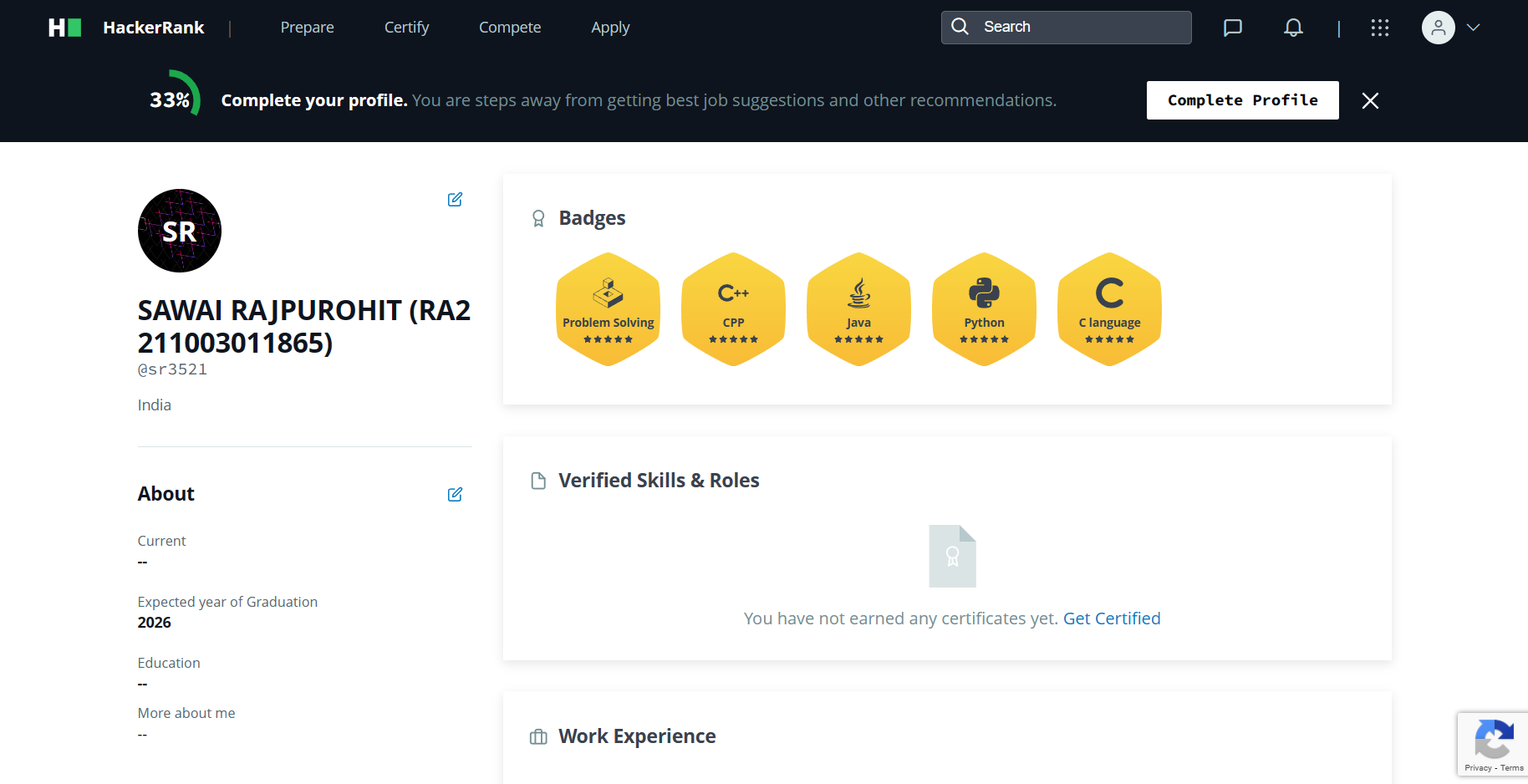I'm Sawai Singh Rajpurohit aged 19 years from Jodhpur,Rajasthan.Currently living in Chennai,India.I am currently studying in II year, purisng BTech from SRM University of Science & Technology,Kattankulathur and will get graduate in May 2026.Throughout this academic career,I have learned many programming languages like C,C++,Python,Java and took part in various research workshops.I finished C and Python in my school time and worked on a lot of Project on C,C++,Python,Java and Web dev. I resolved a lot problems on coding platforms like Hackerrank, LeetCode,CodeTantra and ELab.